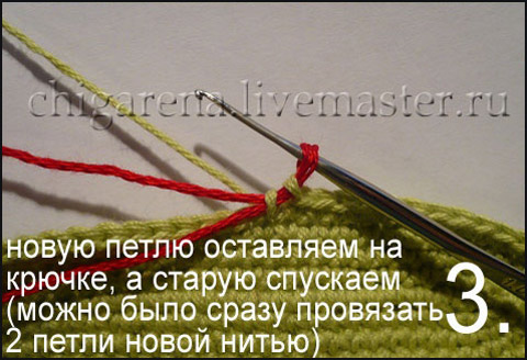 При вязании цветных узоров, появляется необходимость в замене цветов пряжи. Как сделать это правильно и обойтись без узлов, вы узнаете посмотрев мастер - класс с фото.