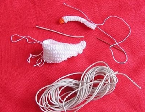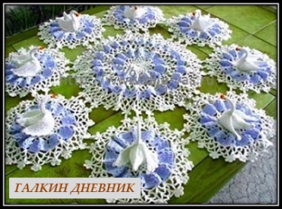 Лебеди расположенные по отдельным деталям вокруг центрального круга, замыкают изделие и не смотря на то, что салфетка состоит из отдельных элементов, выглядит она как единое целое. Для завершения композиции, можно связать маленькие листики камыша и закрепить их в середине центрального круга.